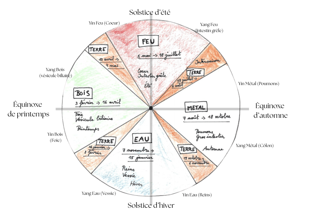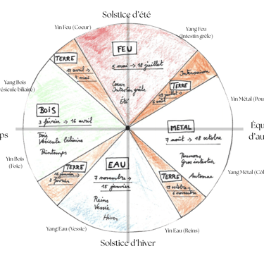 Chaque élément est associé à une saison, une couleur, un mouvement, un moteur, un organe vital, un son de guérison, une période de la journée/nuit, des viscères, une direction, des émotions, etc.