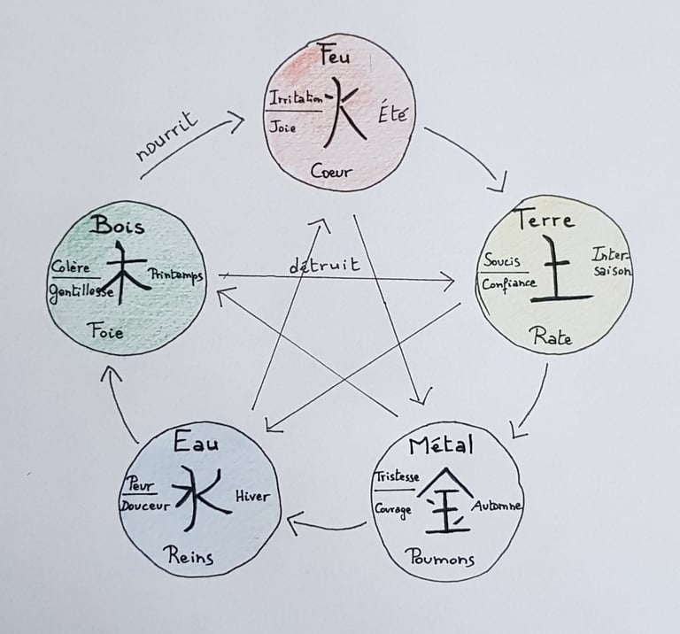 Avant d'aborder les deux cycles d'engendrement et d'apaisement, voyons d'abord les cinq éléments pris individuellement.
